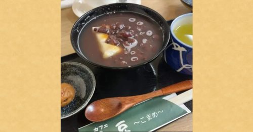 カフェ小豆特製ぜんざいを500円にてご提供、またお食事をされた方にランチドリンク(ホットコーヒー又は紅茶) 無料!